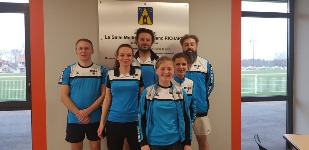 Malgré la blessure samedi de Séverine, l’équipe 3, renforcée pour la fin de saison par la présidente en personne le jour de son anniversaire, Aurore, poursuit sa lancée. Première journée à l’extérieur, nous nous rendions dans le sud Messin et le superbe et tout neuf gymnase de CUVRY. Nous avons commencé par affronter nos amis d’HAYANGE en dernier match « aller » de la saison. Même avec un capitaine qui se coince le dos avant de débuter la rencontre (et oui un jeune trentenaire de plus dans l’équipe), on passe à deux doigts du sans faute, gagnant 7-1.