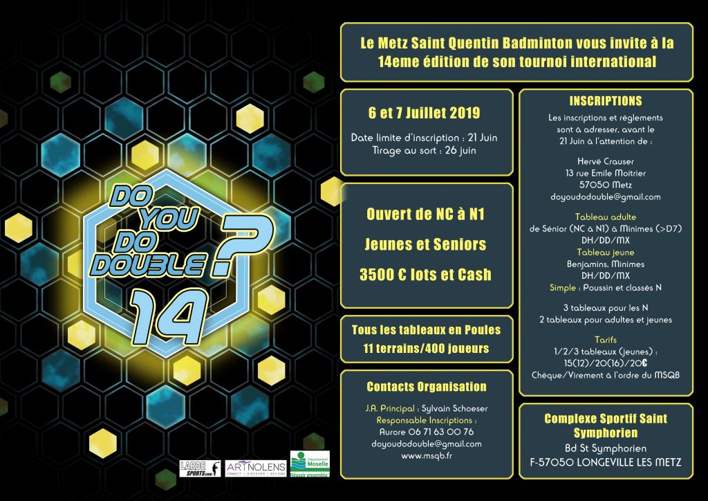 Le Metz Saint Quentin Badminton a le plaisir de vous inviter à sa 14 ème édition du DoYouDoDouble qui se déroulera le 6 et 7 juillet 2019 au complexe sportif St Symphorien à Longeville-lès-Metz